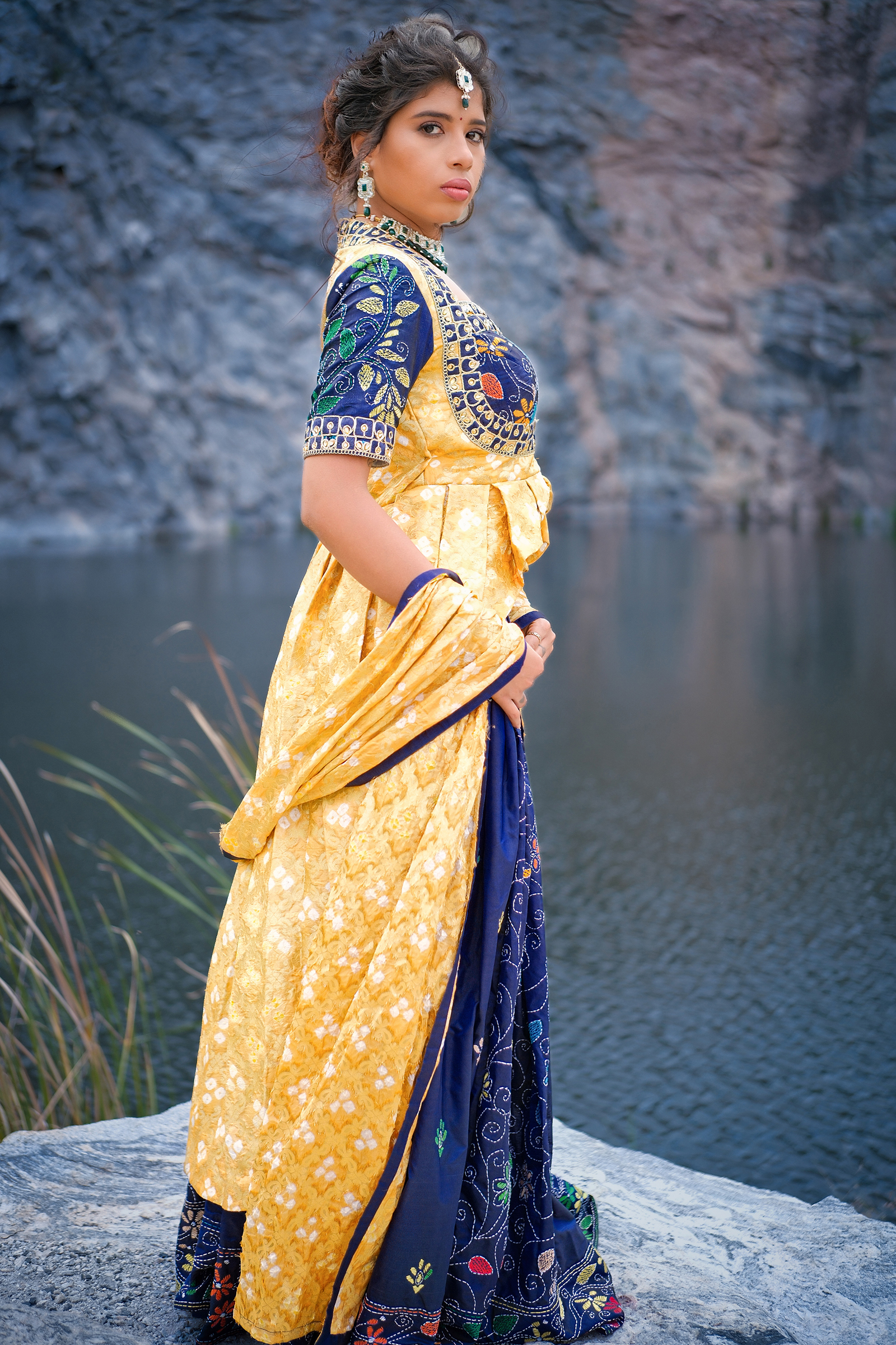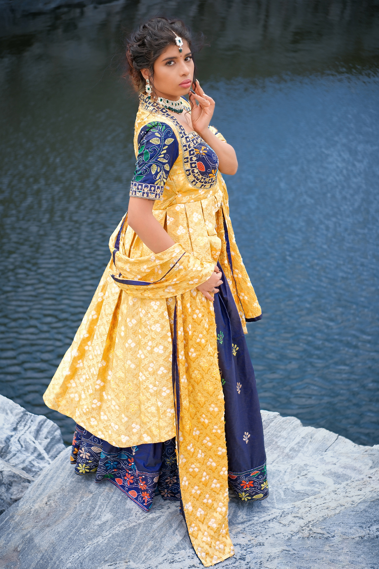 This striking ensemble features a mustard Bandhani silk pleated long blouse paired with a lehenga beautifully adorned with intricate Bengal Kantha stitching. Complemented by a matching Bandhani silk dupatta, the outfit perfectly blends vibrant prints and traditional craftsmanship, creating a bold yet elegant ethnic look ideal for festive occasions.