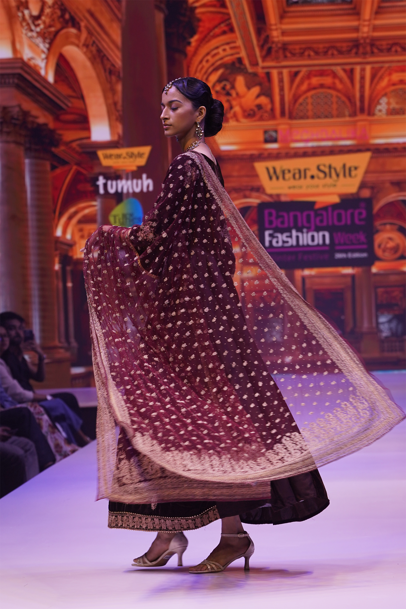 This Deep Brown Velvet Ethnic Kashmiri Gown exudes royal elegance with its rich fabric and intricate traditional embroidery. Handcrafted details reflect the artistry of Kashmiri heritage, making it a perfect choice for festive or formal occasions. The luxurious velvet drapes beautifully, offering both warmth and sophistication.