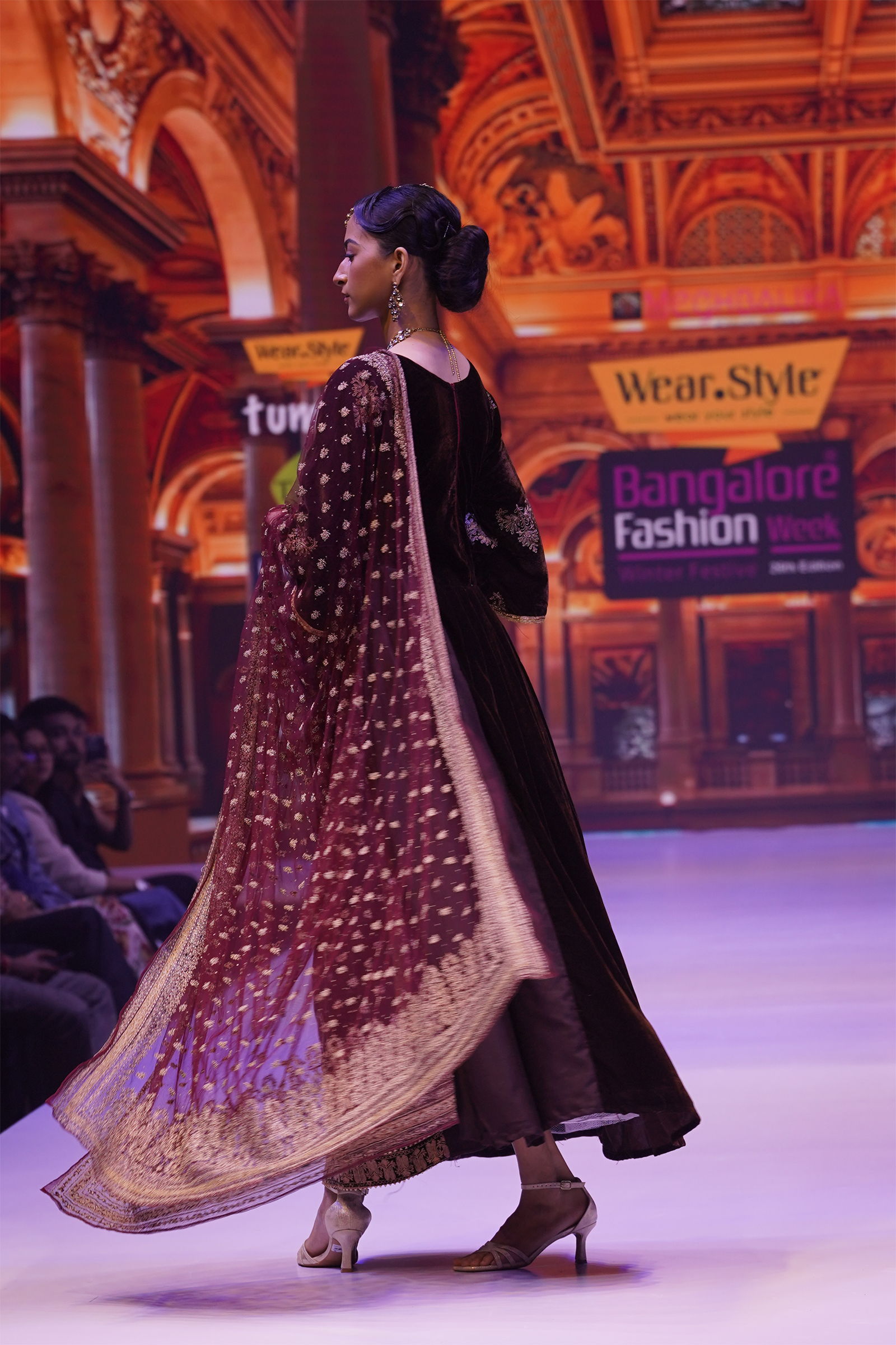Elegant deep brown velvet Kashmiri gown adorned with intricate ethnic embroidery for a regal, timeless look.