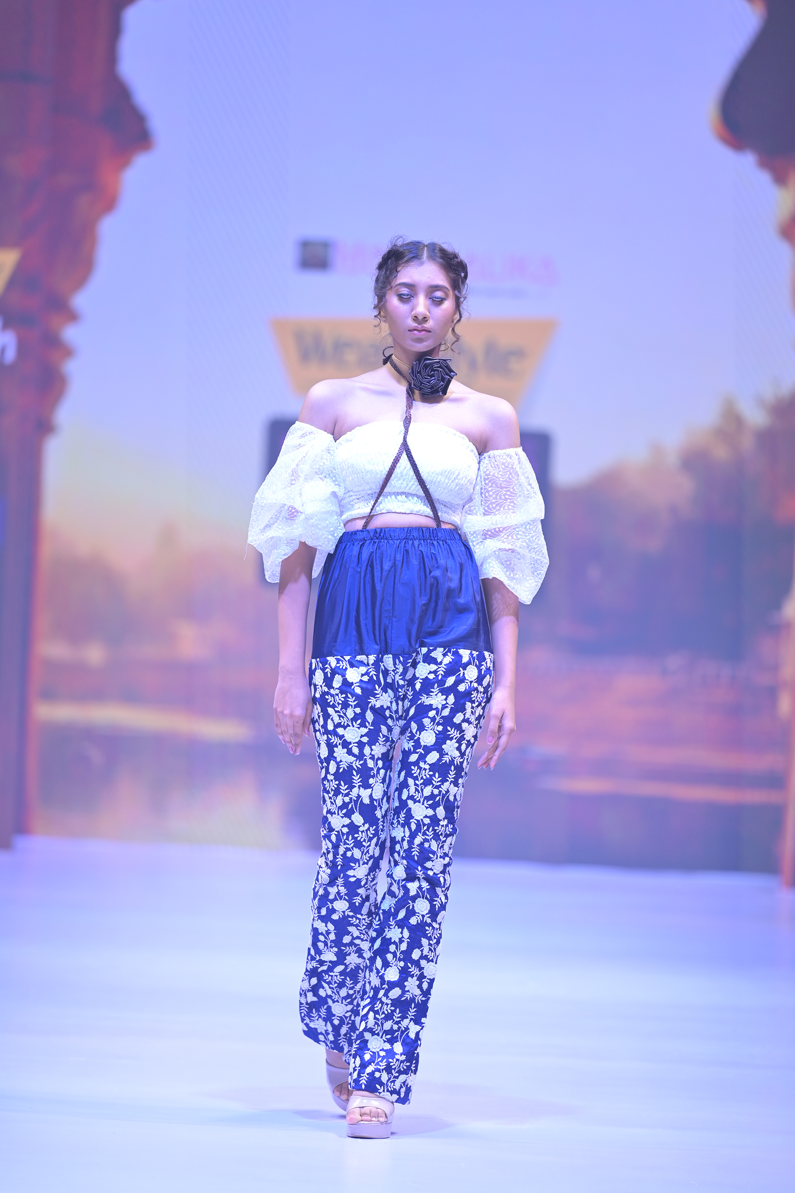 This ensemble features a crisp white crop top paired with white bell-bottomed pants adorned with intricate blue floral silk embroidery, creating a perfect blend of elegance and modern flair. The detachable sleeves add versatility, allowing you to customize your look for any occasion. Ideal for festive events or stylish gatherings.