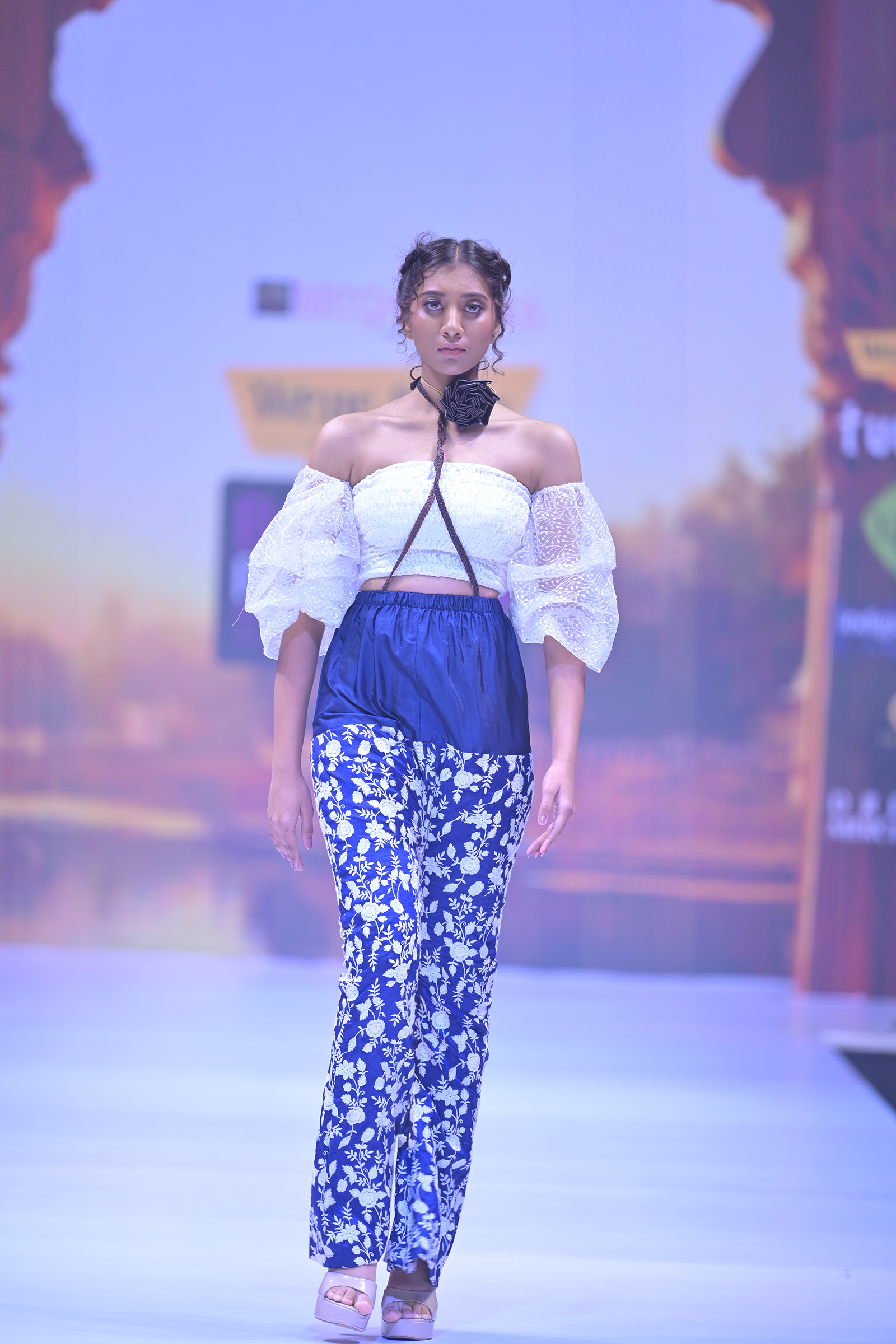 Chic white crop top paired with white bell-bottomed pants featuring blue floral silk embroidery and versatile detachable sleeves for a stylish, contemporary look.