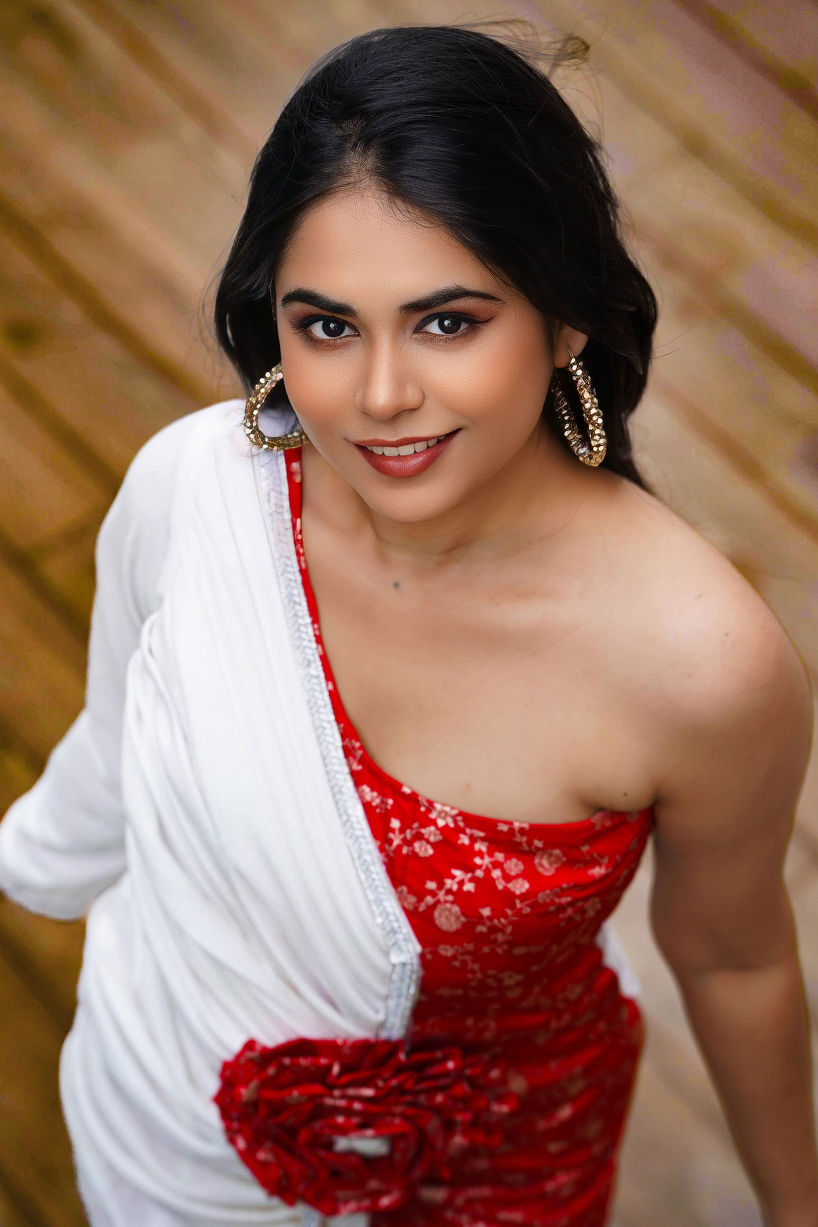This stunning gown combines shimmery white fabric with rich red Benarasi accents, creating a striking fusion of textures and colors. The wavy asymmetrical design adds dynamic movement and contemporary flair, making it perfect for those seeking a bold yet elegant look. Ideal for festive occasions or glamorous events.