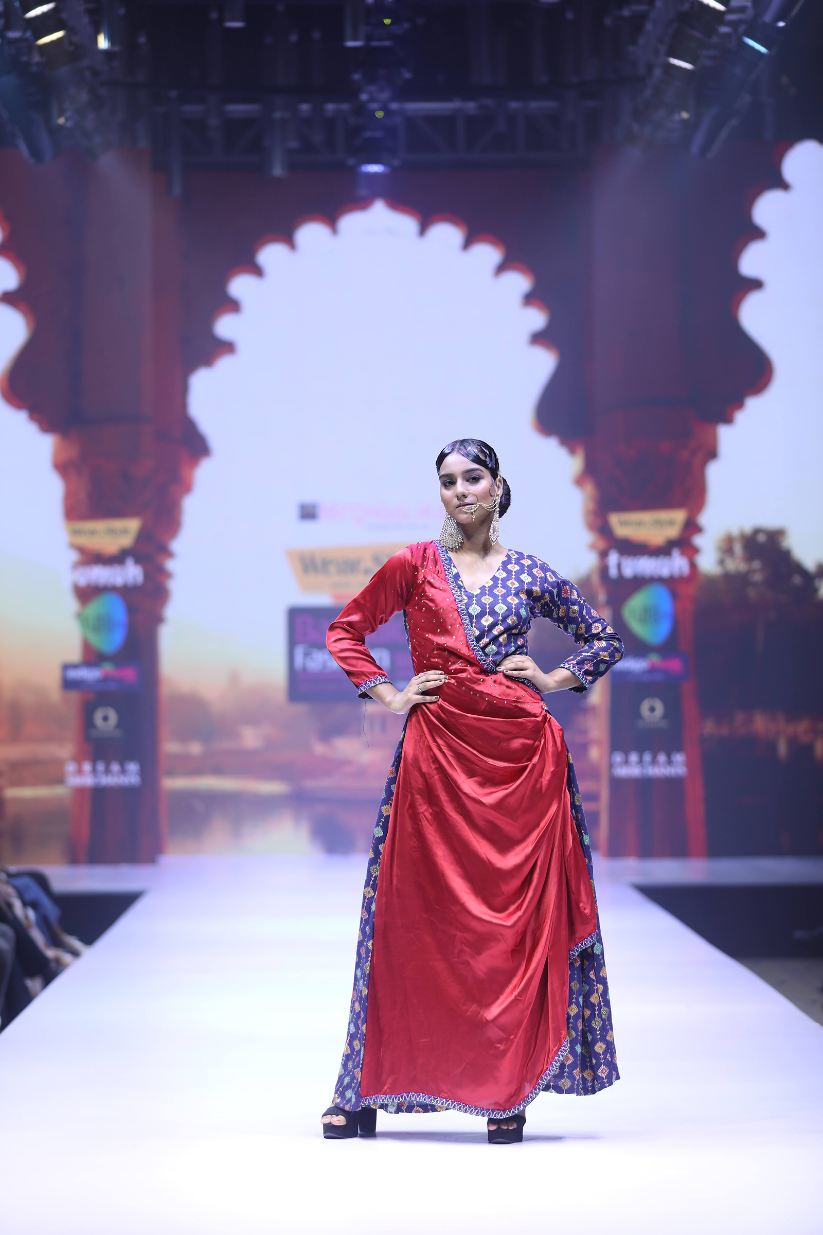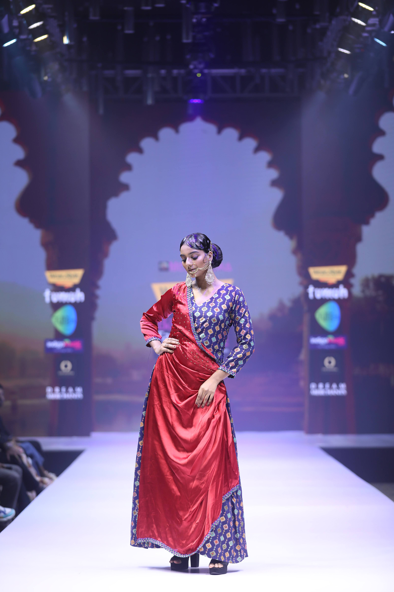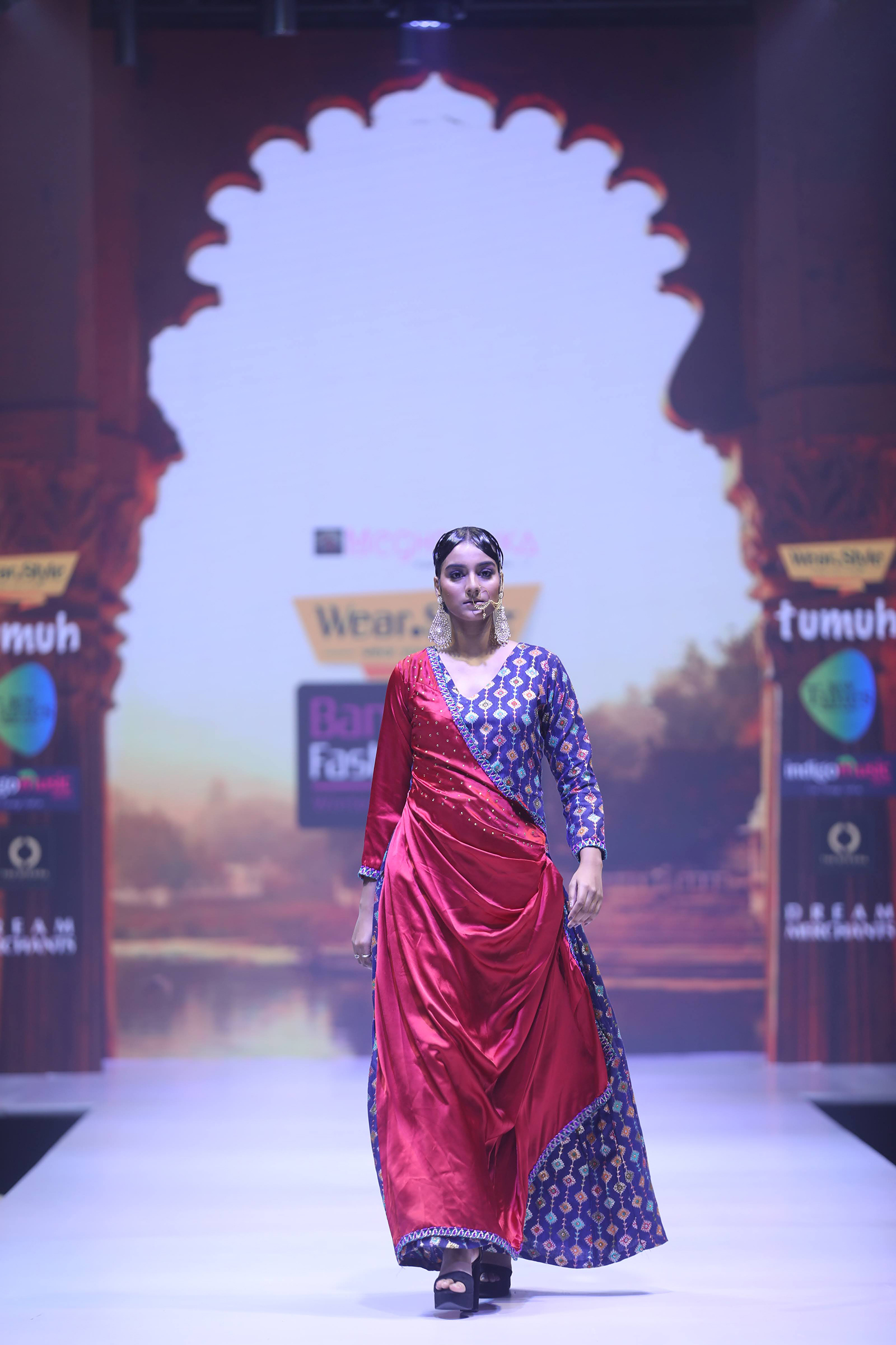 This Red & Blue Satin Ethnic Gown features flowing wavy pleats that create a striking, graceful silhouette. The rich satin fabric enhances its luxurious appeal, while the vibrant color combination adds a festive charm. Perfect for weddings, receptions, or grand cultural events.
